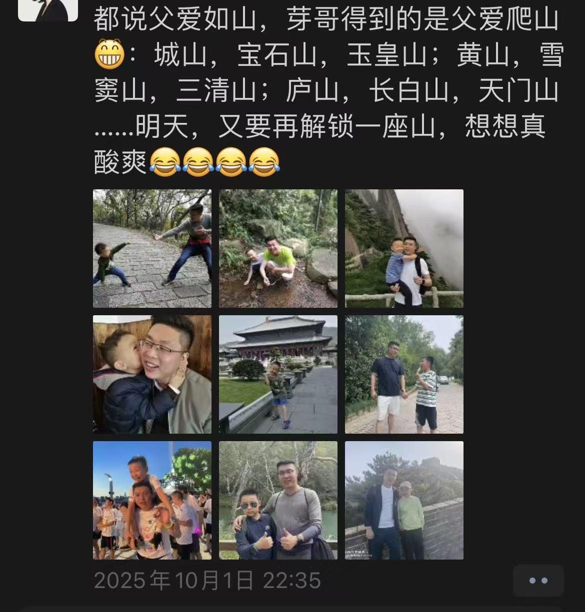 “都说父爱如山,芽哥得到的是父爱爬山:城山、宝石山、玉皇山;黄山、雪窦山、三清山;庐山、长白山、天门山……明天又要再解锁一座山,想想真酸爽。”